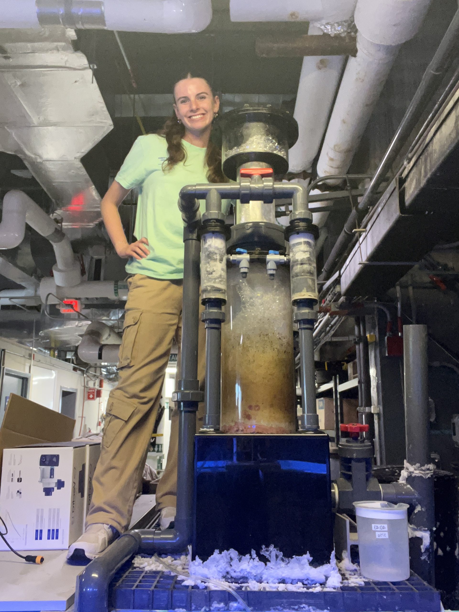 - Charly stands next to a protein skimmer machine, which filters out waste and uneaten food from aquarium tanks.